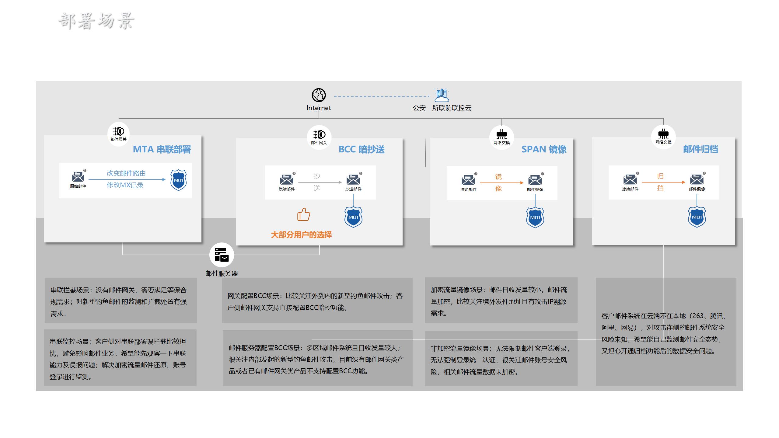 采用串联、旁路、 BCC、归档多种部署模式满足拦截、 监测、溯源分析等应用场景